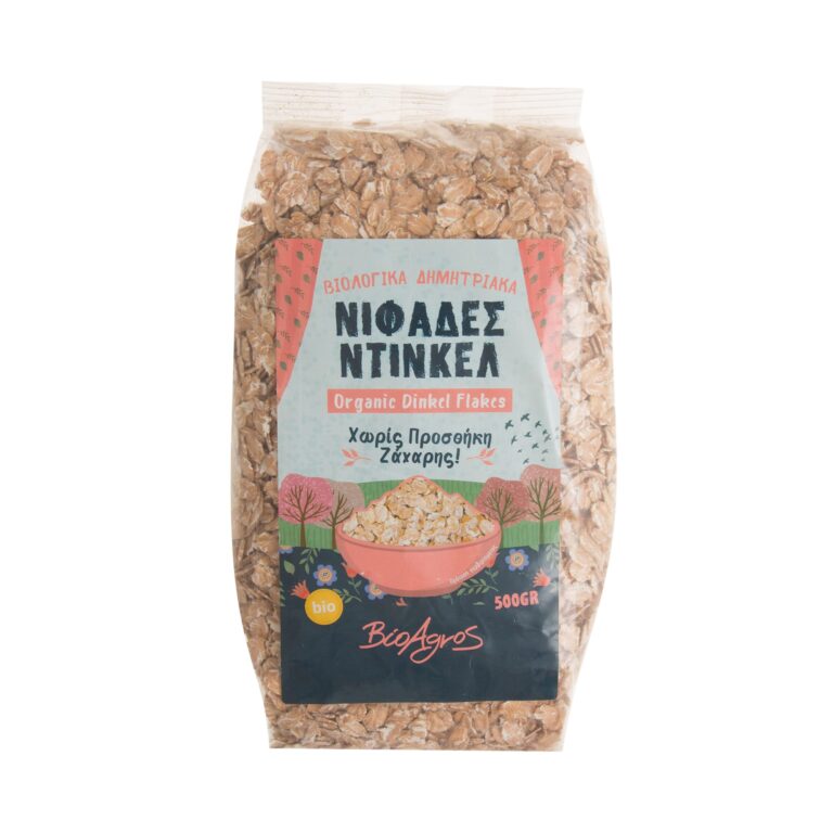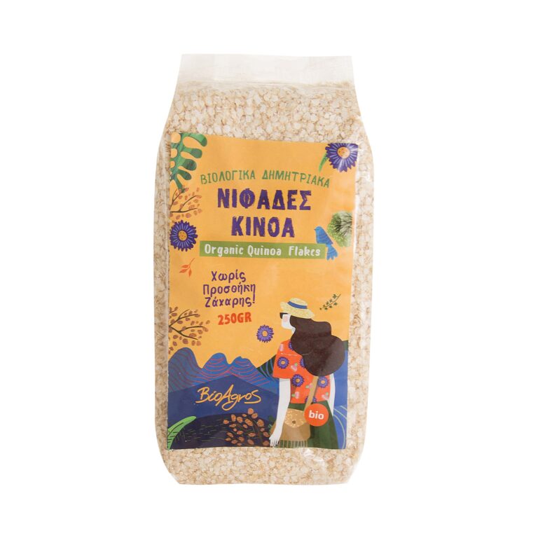Προϊόν βιολογικής γεωργίας. Συστατικά: κινόα βιολογικής γεωργίας. Βιολογικές νιφάδες κινόα υψηλής περιεκτικότητας σε εδώδιμες ίνες και πολύ χαμηλής σε αλάτι