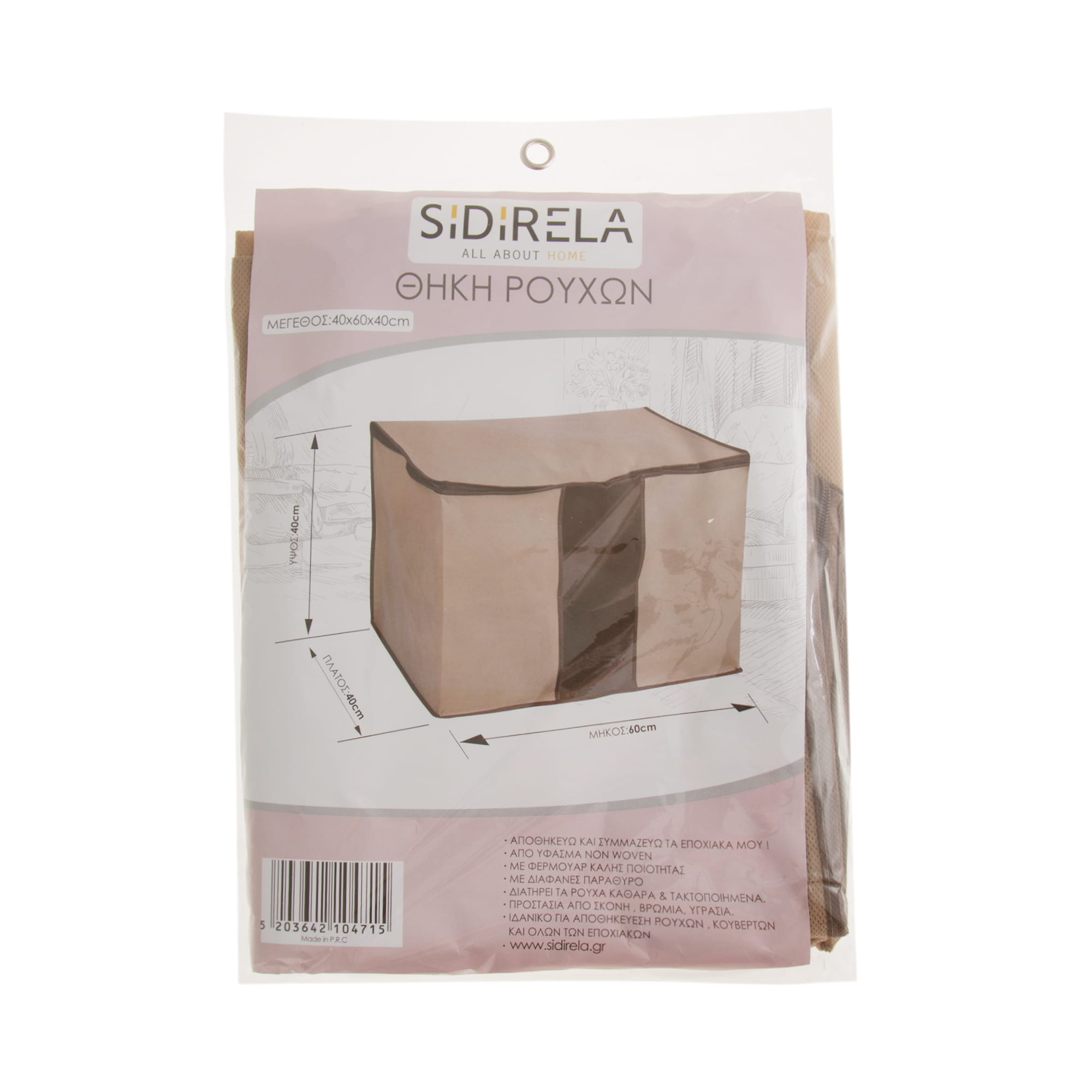 Θήκη ιδανική για τη φύλαξη ογκωδών ρούχων (κουβέρτες, παπλώματα κλπ.), με διαστάσεις (ΜxΠxΥ): 40 x 60 x 40 εκ.