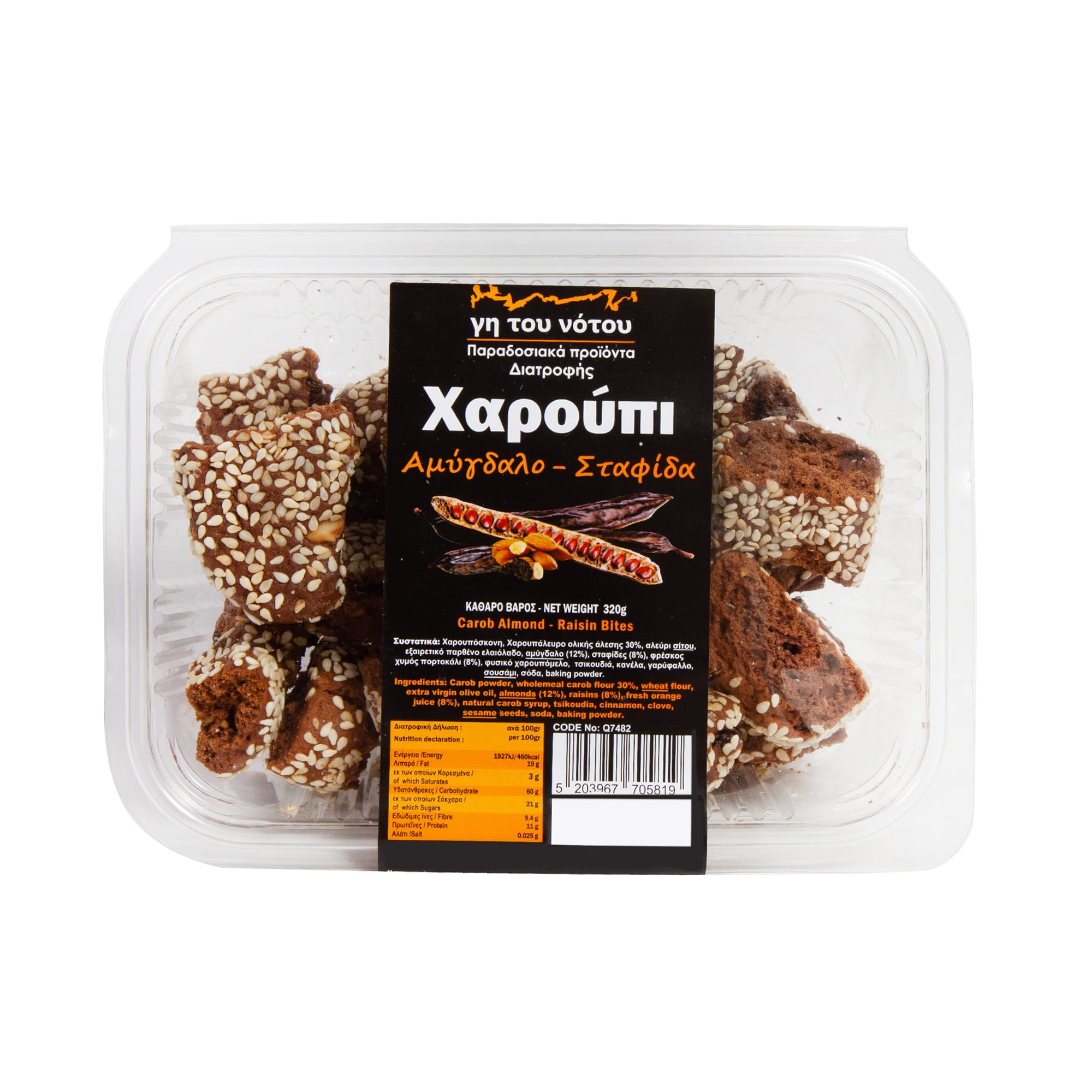 Συστατικά: χαρουπόσκονη, χαρουπάλευρο ολικής άλεσης (30%), αλεύρι σίτου, εξαιρετικό παρθένο ελαιόλαδο, αμύγδαλα (12%), σταφίδες (8%), φρέσκος χυμός πορτοκάλι (8%), φυσικό χαρουπόμελο, τσικουδιά, κανέλα, γαρύφαλλο, σουσάμι, σόδα, μπέικιν πάουντερ.