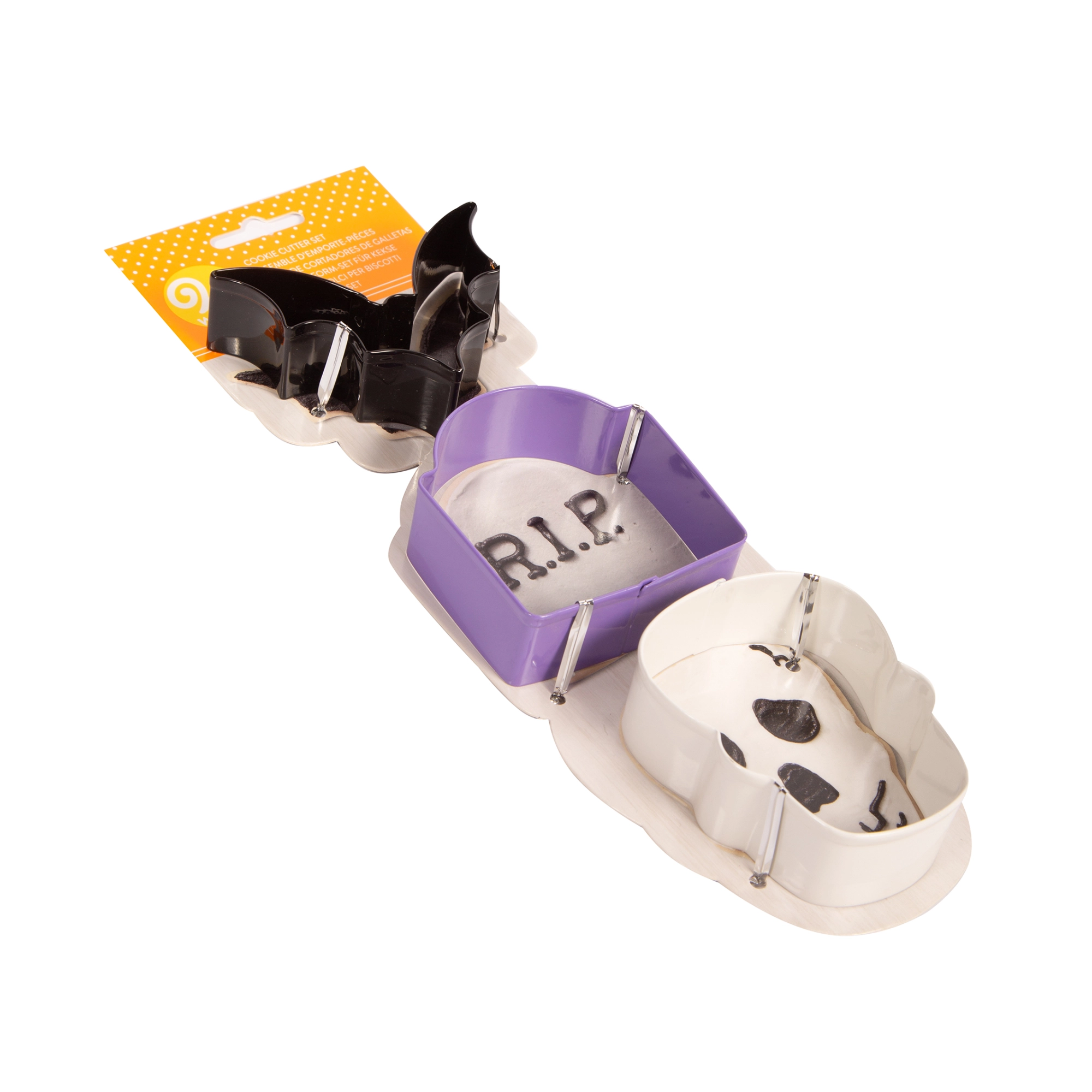 Φτιάξτε τα πιο τρομακτικά και διασκεδαστικά μπισκότα με το σετ μεταλλικών κουπάτ Wilton που περιλαμβάνει Νυχτερίδα, Ταφόπλακα και Κρανίο. Το ιδανικό σετ για Halloween δημιουργίες, θεματικά πάρτι ή διακοσμητικά γλυκίσματα!
