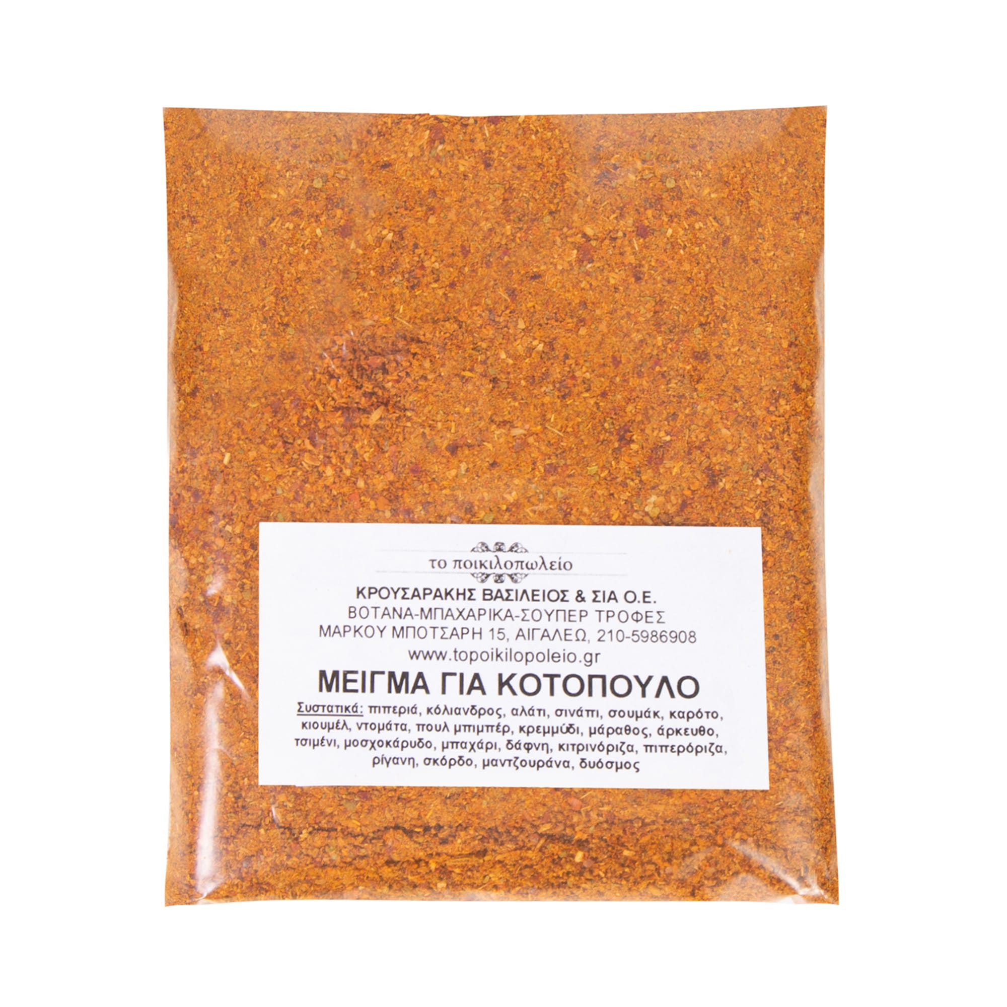 Συστατικά: πιπεριά, κόλιανδρος, αλάτι, σουμάκ, σινάπι, πούλ μπιμπέρ, ρίγανη, δυόσμος, βασιλικός, μοσχοκάρυδο, κιουμέλ, ντομάτα, μάραθος, τσιμένι, μαντζουράνα, σκόρδο, κρεμμύδι, πιπερόριζα, δάφνη, κιτρινόριζα, μπαχάρι, άρκευθος.