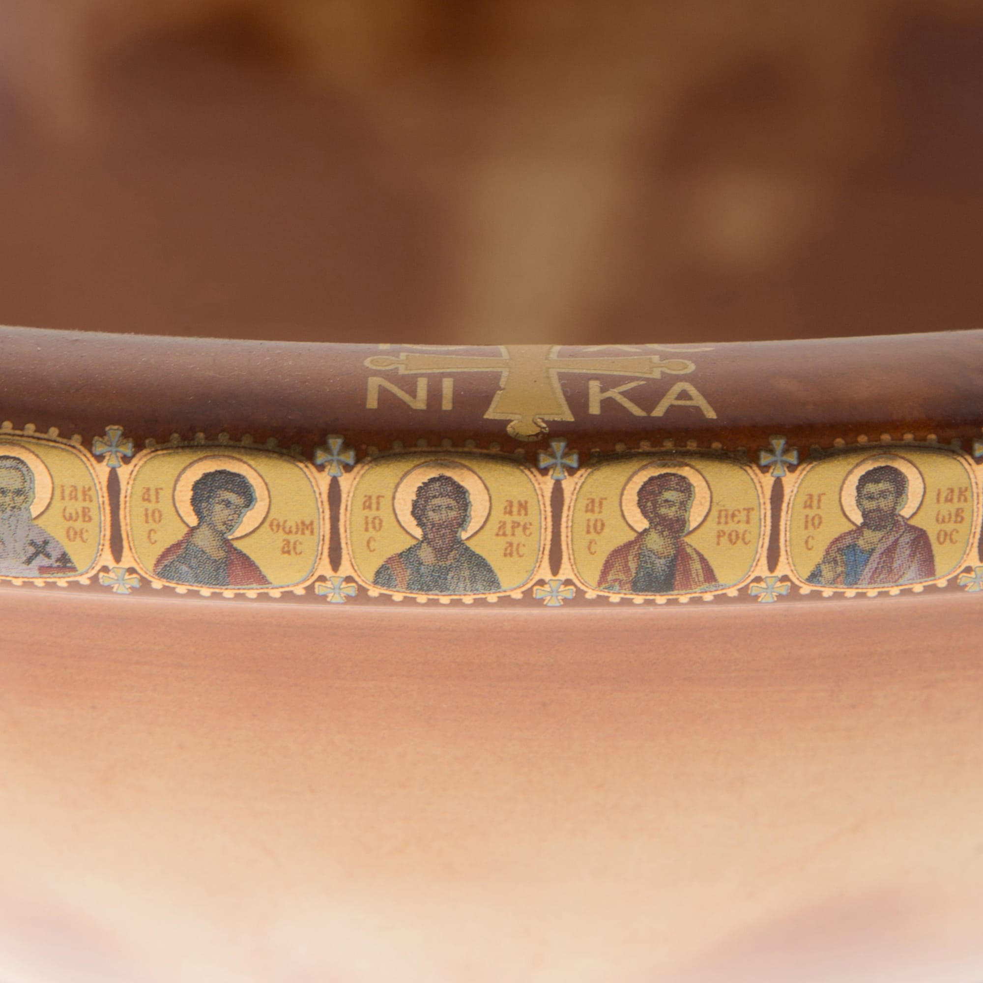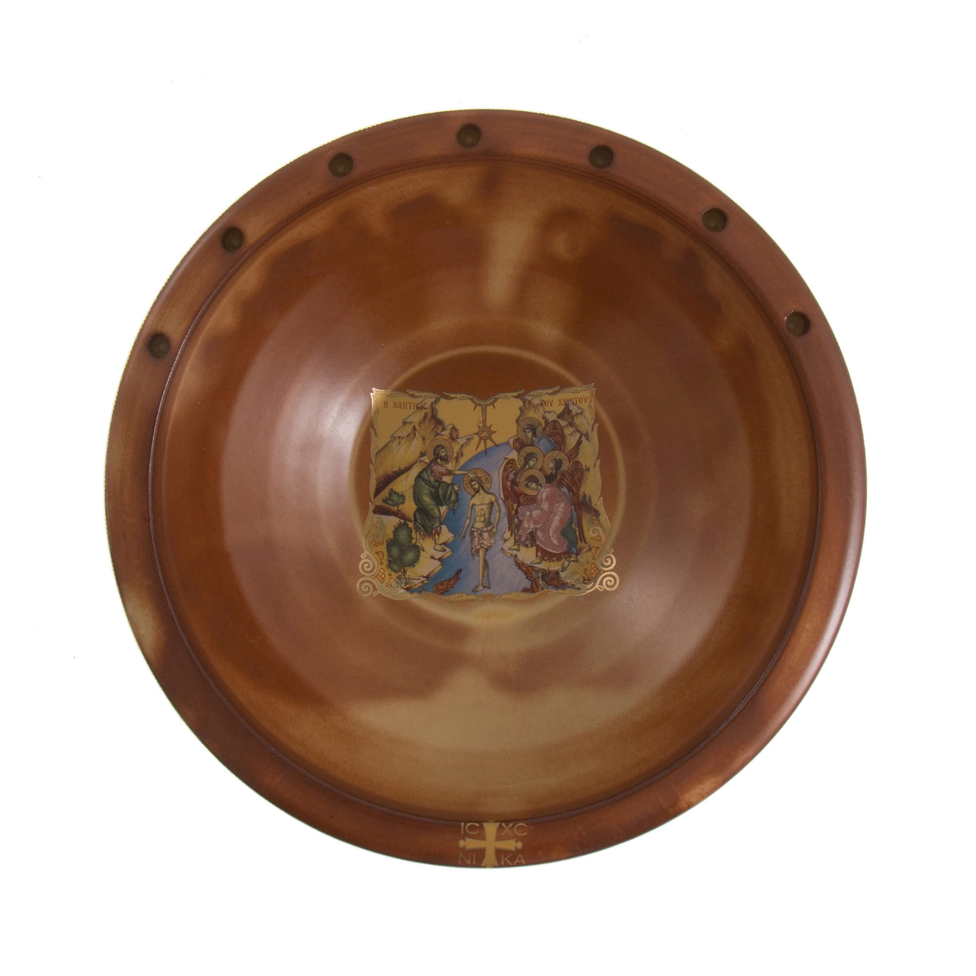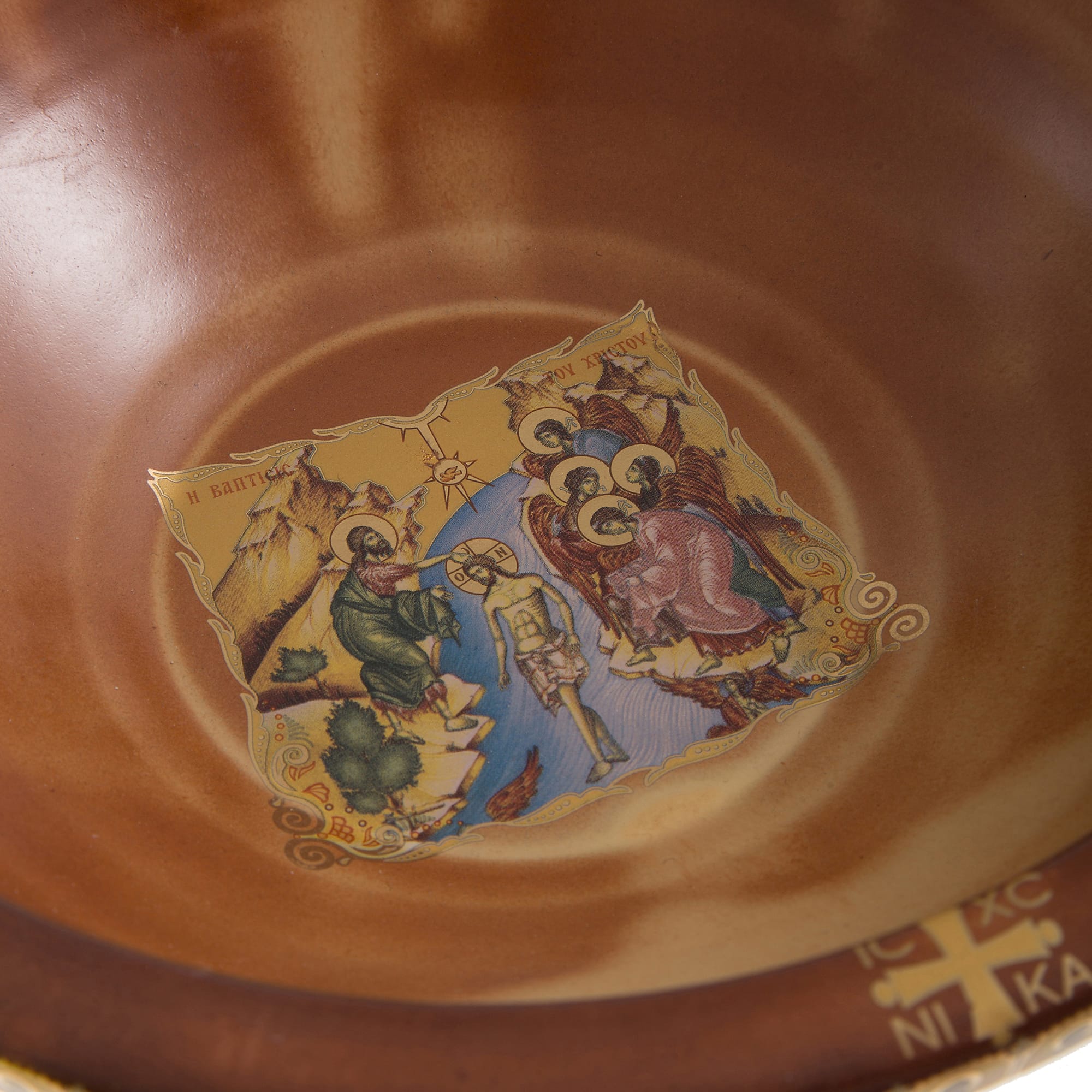 Εξαιρετικής ποιότητας πήλινο μπολ για πρόσφορο, με χρυσοτυπία τις εικόνες αγίων στο χείλος και την παράσταση της Βάπτισης στον πάτο.