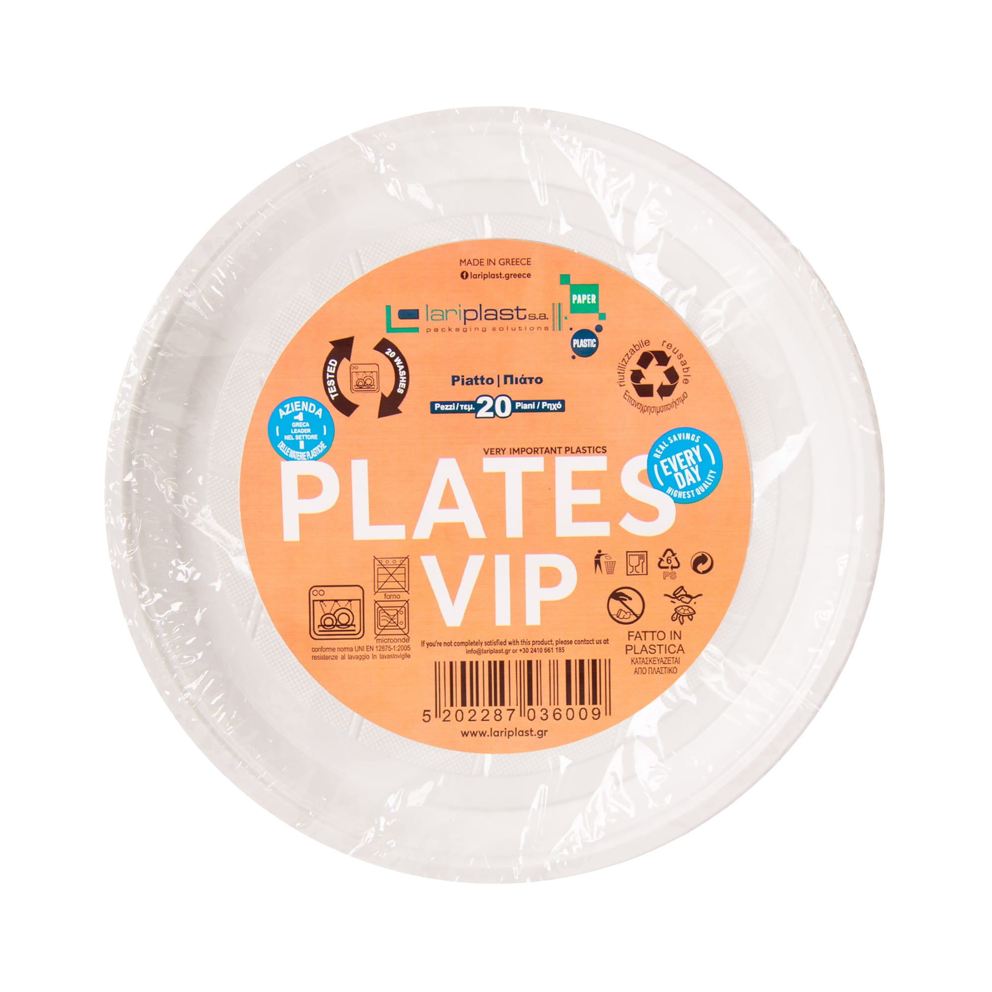 Επαναχρησιμοποιήσιμα και 100% ανακυκλώσιμα πιάτα από πλαστικό υψηλής ποιότητας, που επιτρέπει το πλύσιμό τους στο πλυντήριο πιάτων έως και 20 φορές!