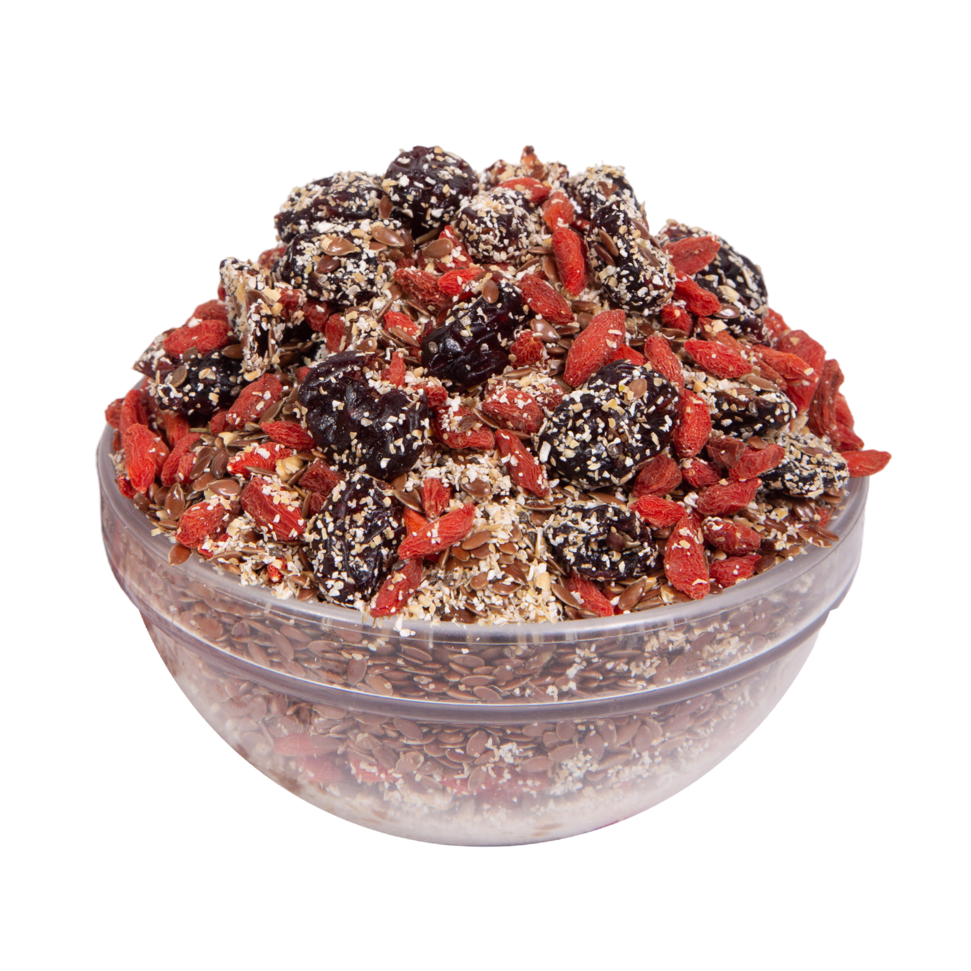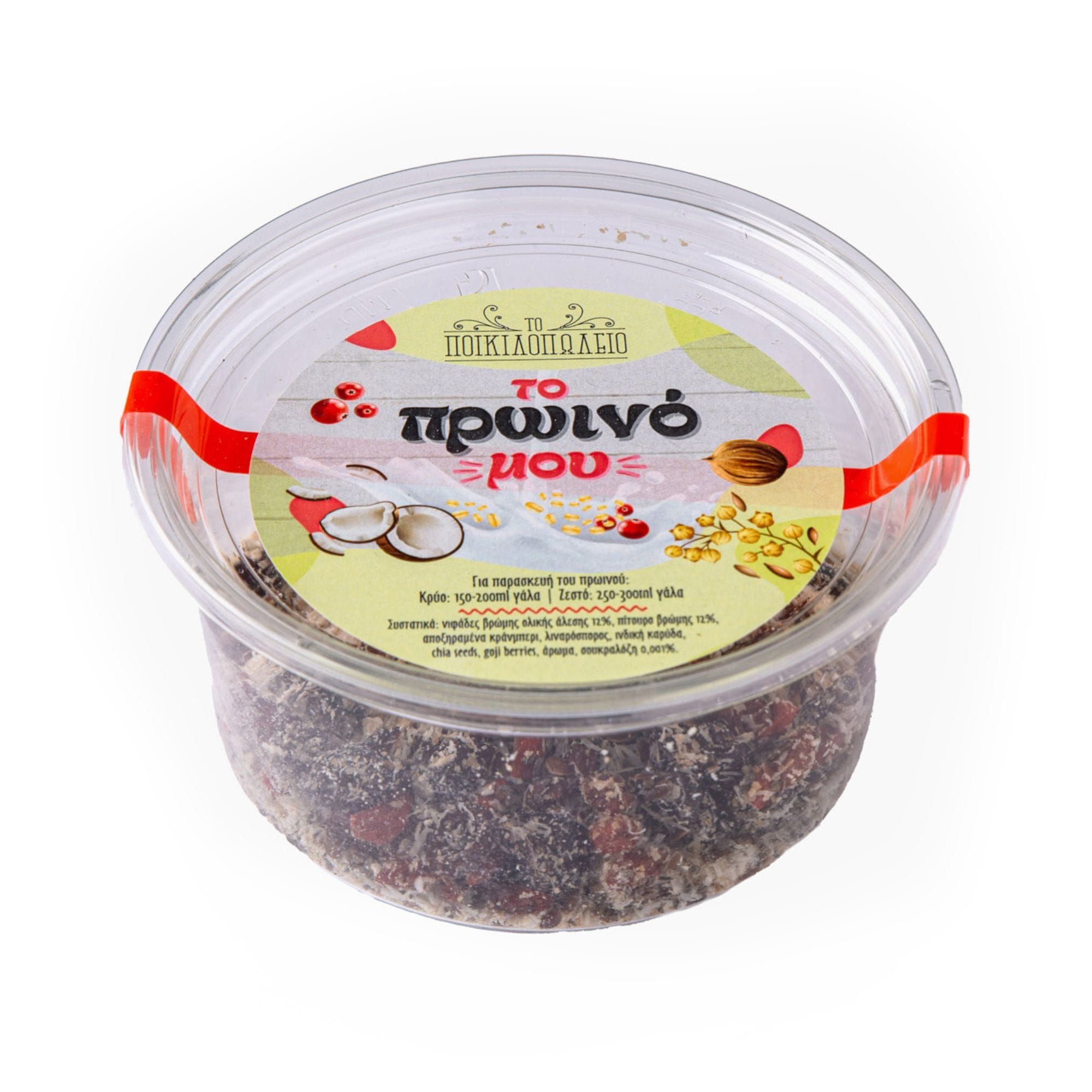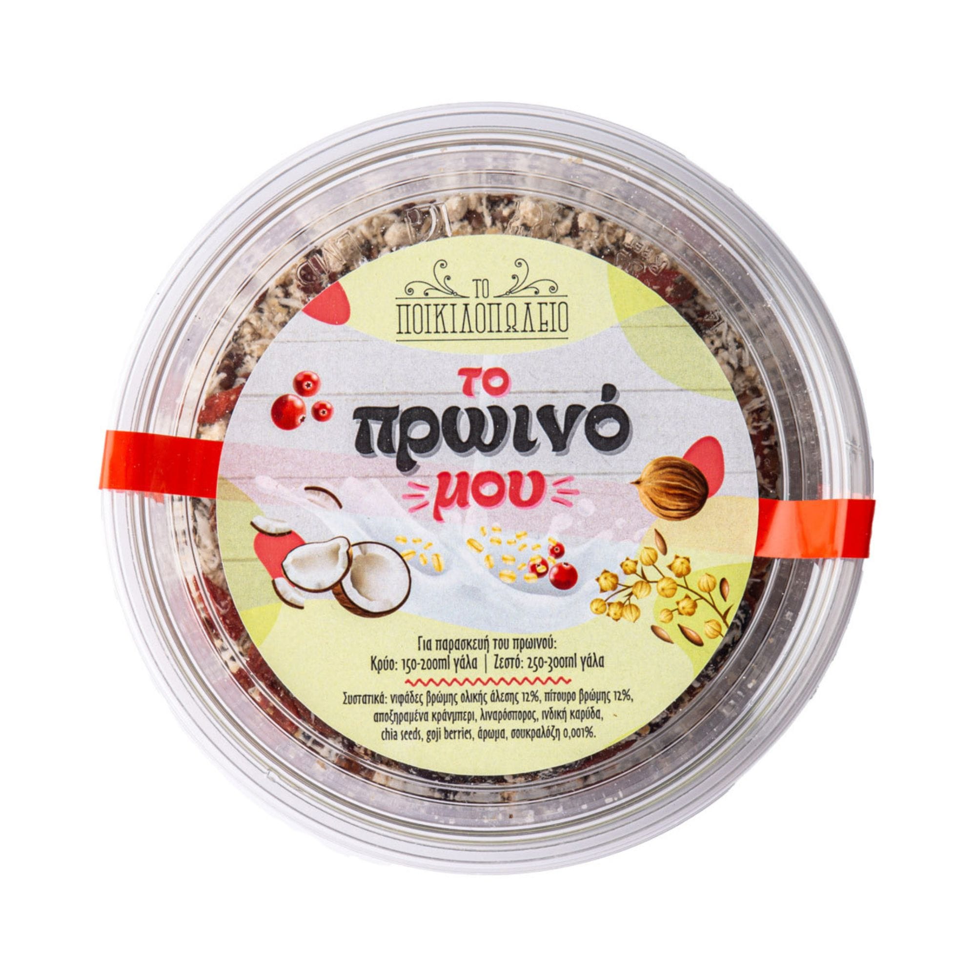 Συστατικά: νιφάδες βρώμης ολικής (12%), πίτουρο βρώμης (12%), αποξηραμένα κράνμπερι, λιναρόσπορος, ινδική καρύδα, σπόροι chia, γκότζι μπέρι, άρωμα, σουκραλόζη (0,001%).